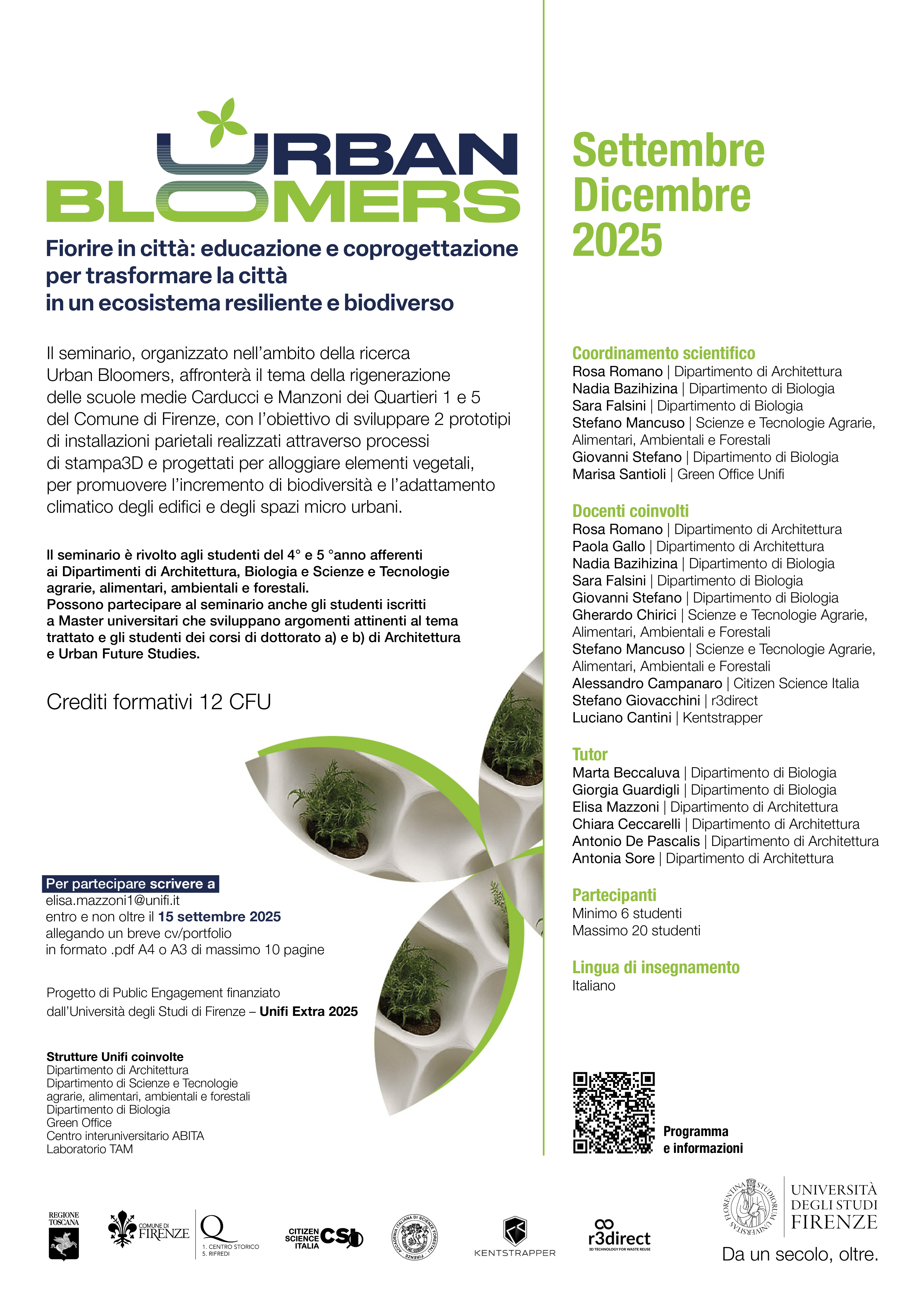 Il seminario, organizzato nell’ambito della ricerca Urban Bloomers, affronterà il tema della rigenerazione delle scuole medie Carducci e Manzoni dei Quartieri 1 e 5 del Comune di Firenze, con l’obiettivo di sviluppare 2 prototipi di installazioni parietali realizzati attraverso processi di stampa 3D e progettati per alloggiare elementi vegetali, per promuovere l’incremento di biodiversità e l’adattamento climatico degli edifici e degli spazi micro urbani.