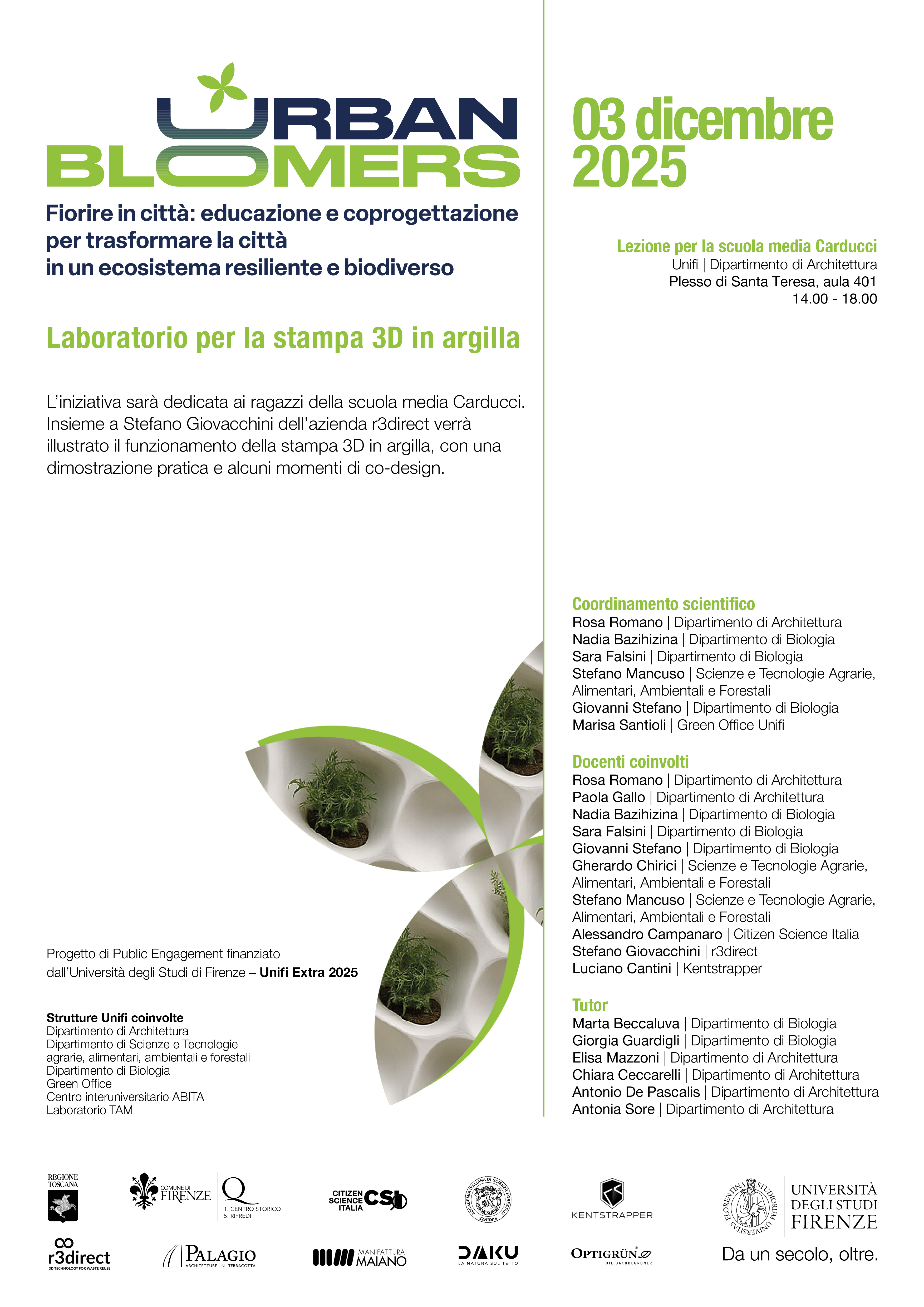 Insieme a Stefano Giovacchini, designer e fondatore dell'azienda r3direct, i ragazzi scopriranno il funzionamento delle stampanti 3D in argilla, assistendo a dimostrazioni pratiche e partecipando a momenti di co-design.